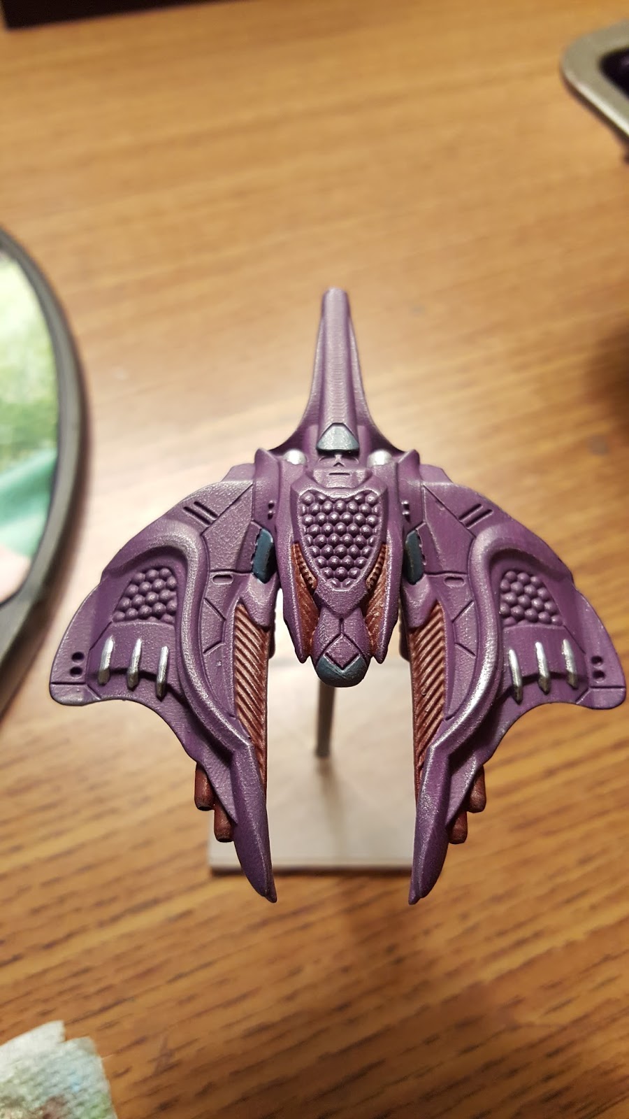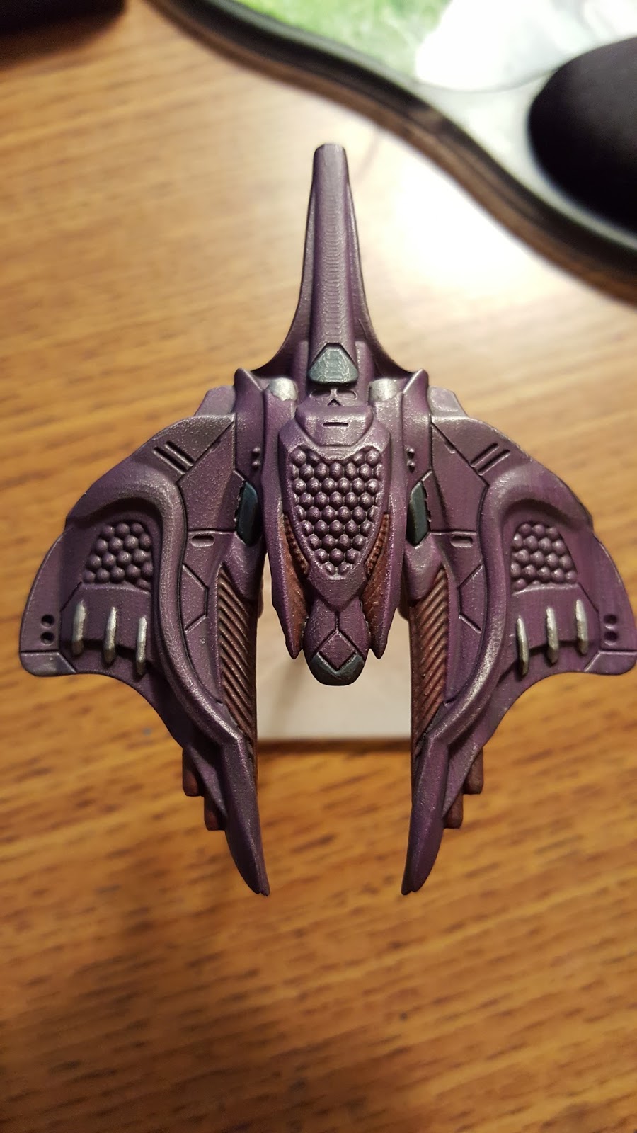| Here's the model I'm going to be showing you. After priming and gluing to its base, I painted it purple with two layers of the purple I showed you and made sure it was entirely dry in between. Layer them lightly to keep it smooth. This picture shows it with the purple still a little wet. This step is called the base coat. |